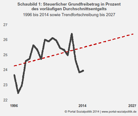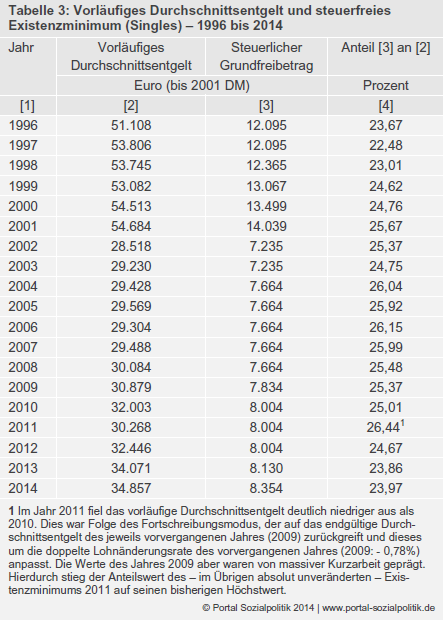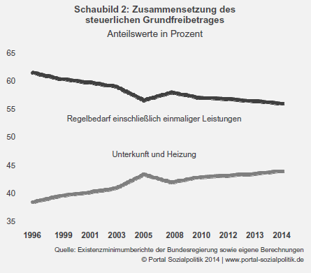 In den Jahren 1996 bis 2014 stieg der steuerliche Grundfreibetrag im Trend leicht stärker als das (vorläufige) Durchschnittsentgelt. Im Schnitt der 19 Jahre betrug der Anteilswert 25 Prozent. Hierbei kommt den Kosten für Unterkunft und Heizung eine kontinuierlich zunehmende Bedeutung für die Höhe des Existenzminimums Alleinstehender zu.