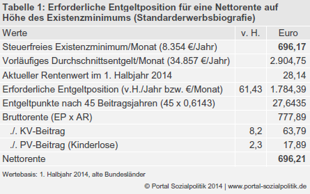 Auf Basis der (zum Teil vorläufigen) Werte für das erste Halbjahr 2014 ist eine erwerbslebensdurchschnittliche Entgeltposition von 61,43 Prozent (= 0,6143 EP/Jahr) notwendig, um nach 45 Beitragsjahren eine Nettorente in Höhe des auf den Kalendermonat umgerechneten steuerfreien Existenzminimums [6] zu erzielen (Tabelle 1). Liegt die durchschnittliche Entgeltposition unterhalb dieses Schwellenwertes, so kann das Existenzminimum alleine mit der Nettorente nicht erreicht werden.