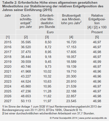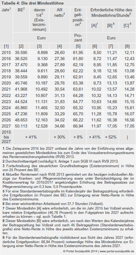 Der von der Koalition ab dem Jahr 2015 bzw. 2017 geplante gesetzliche Mindestlohn wird der Höhe nach absehbar nicht ausreichen, um dem hier formulierten normativen Anspruch zu genügen. Bereits im vorgesehenen Einführungsjahr liegt er um 2,71 Euro unterhalb der für erforderlich erachteten Mindestbemessungsgrundlage; der absolute Abstand wird in den Folgejahren selbst dann weiter steigen, wenn die Entwicklung des Mindestlohns Schritt halten sollte mit der Entwicklung des Durchschnittsentgelts (vgl. Tabelle 4, Spalten [6] und [7]). Eine Mindestbemessungsgrundlage ist daher in Ergänzung des gesetzlichen Mindestlohns mit Blick auf die Altersvorsorge sowie für die Stärkung der Akzeptanz des Pflichtversicherungssystems unabdingbar.