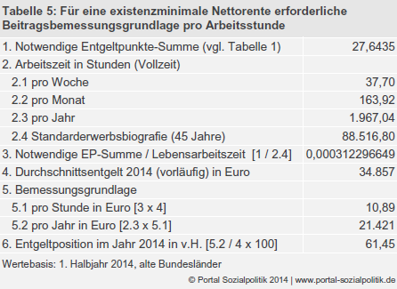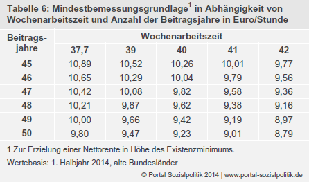 Tabelle 5 veranschaulicht einen möglichen Rechenweg zur Bestimmung einer Mindestbemessungsgrundlage für das Jahr 2014: Für eine Nettorente in Höhe des steuerlichen Existenzminimums sind auf aktueller Wertebasis 27,6435 Entgeltpunkte erforderlich – oder eine Entgeltposition von 61,43 Prozent nach 45 Beitragsjahren (vgl. Tabelle 1). Ausgehend von einer durchschnittlichen tariflichen Wochenarbeitszeit von 37,7 Stunden beträgt die Lebensarbeitszeit für die Standarderwerbsbiografie aktuell 88.516,80 Stunden. Der hier auf zwölf Nachkommastellen ausgewiesene Anteil einer Arbeitsstunde am Lebensarbeitszeitvolumen beträgt damit 0,000312296649. Wird dieser Faktor mit dem (vorläufigen) Durchschnittsentgelt des Jahres 2014 multipliziert, ergibt dies eine Mindestbemessungsgrundlage pro Arbeitsstunde in Höhe von 10,89 Euro. – Zur Probe: Aus der Multiplikation der Bemessungsgrundlage pro Stunde (10,89 Euro) mit der Jahresarbeitszeit 2014 (1.967,04 Stunden) ergibt sich eine jährliche Bemessungsgrundlage in Höhe von 21.421 Euro – im Verhältnis zum Durchschnittsentgelt entspricht dies einer Entgeltposition von 61,45 Prozent.