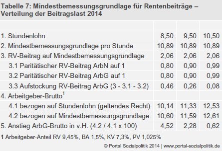 Was eine Mindestbemessungsgrundlage für Rentenbeiträge auf Arbeitsentgelt im Einzelnen bei unterschiedlichen Lohnhöhen bedeutet, kann Tabelle 7 entnommen werden. Bei einem gesetzlichen Mindestlohn von 8,50 Euro und einer Mindestbemessungsgrundlage von 10,89 Euro hätte der Arbeitgeber den auf den Differenzbetrag (2,39 Euro) entfallenden Beitrag zur Rentenversicherung in Höhe von 46 Eurocent pro Stunde aufzustocken. Verglichen mit einem Stundenlohn in Höhe von 8,50 Euro stiege das Arbeitgeber-Brutto um 4,52 Prozent von 10,14 Euro auf 10,60 Euro.