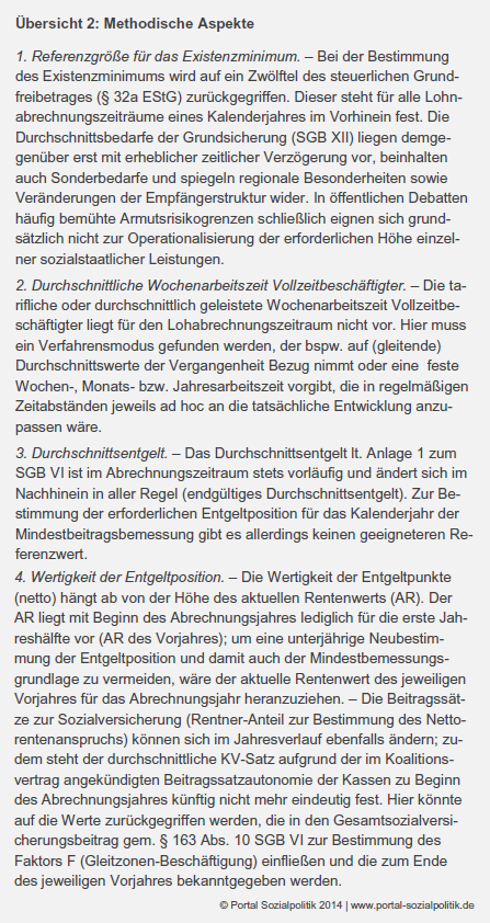 Die im schwarz-roten Koalitionsvertrag festgelegte Mindestlohnhöhe ist zu gering, um nach erwerbslebenslanger Pflichtmitgliedschaft in der gesetzlichen Rentenversicherung eine Rente in Höhe des Existenzminimums zu erreichen. Zudem wird es im politischen Umsetzungsprozess vermutlich eine Reihe von Ausnahmeregelungen geben.