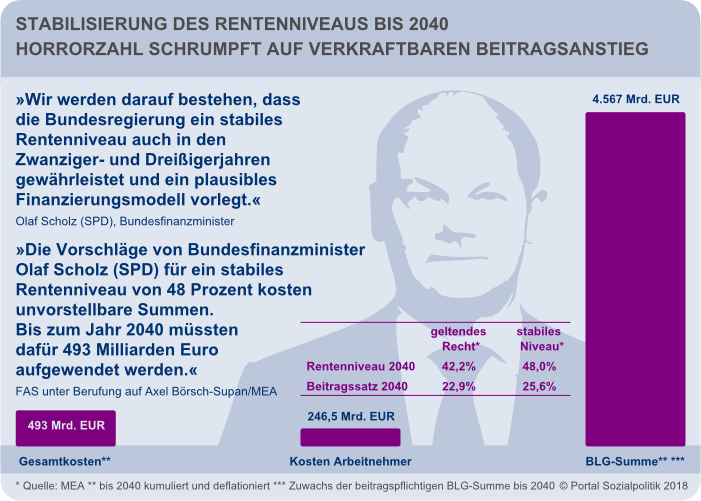 Am 19. August formulierte Bundesfinanzminister und Vizekanzler Olaf Scholz (SPD) gegenüber der Bild am Sonntag (BamS): »Wir werden darauf bestehen, dass die Bundesregierung ein stabiles Rentenniveau auch in den Zwanziger- und Dreißigerjahren gewährleistet und ein plausibles Finanzierungsmodell vorlegt. Das hat für uns hohe Priorität.« Seither scheint der politische Streit um Finanzierung und Leistungsniveau der Rentenversicherung neu entbrannt. Am 26. August präsentierte die Frankfurter Allgemeine Sontagszeitung (FAS) die vermeintlichen Folgekosten: »Die Vorschläge (…) für ein stabiles Rentenniveau von 48 Prozent kosten unvorstellbare Summen. Bis zum Jahr 2040 müssten dafür 493 Milliarden Euro aufgewendet werden (…) Das haben Berechnungen des renommierten Rentenökonomen Axel Börsch-Supan (…) ergeben.« – Börsch-Supan ist pikanterweise eines von zehn Mitgliedern der von Arbeitsminister Heil eingesetzten unabhängigen Rentenkommission.