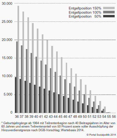 Im Referenz-Szenario (abschlagsgeminderte Rente mit 63) nimmt die Höhe der Abschläge bis zum Jahrgang 1964 kontinuierlich zu; bei gegebener Anzahl an Entgeltpunkten sinkt damit die auf heutiger Wertebasis berechnete Höhe der Rente. Gleiches gilt für die Teilrente ab 60 Jahren; umgekehrt steigt hierdurch aber auch die maximal zulässige Höhe des Hinzuverdienstes (vormaliges Bruttoentgelt minus Teilrente), was wiederum zu leicht höheren Rentenanwartschaften pro Monat der Weiterarbeit für die jüngeren Jahrgänge führt.