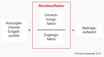Dies entspricht der Beitragszahlung eines Durchschnittsverdieners zur Rentenversicherung im Kalenderjahr 2014 – wobei als Durchschnittsverdienst das vorläufige Durchschnittsentgelt nach Anlage 1 zum SGB VI heranzuziehen ist. Der Rückkauffaktor ergibt sich aus der Division des Umrechnungsfaktors durch den individuellen Zugangsfaktor; er beträgt im Beispiel